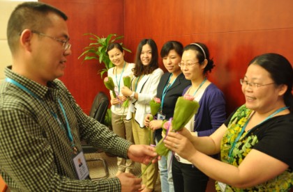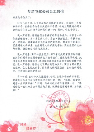 女工委会议  工会主席送花  送花 母亲节,以什么方式向妈妈们表达祝福呢?5月10日上午,公司女工委就组织了一场特殊的母亲节活动。 致母亲们一封信。“说一声感谢,感谢你们含辛茹苦的养育和教导,培养了一群如此聪敏机智、多才多艺的儿女,为公司抛洒热血、贡献青春。说一声感谢,感谢奋战在工作岗位的妈妈们,隧道公司的事业,既是隧道人的事业,也是隧道人的家庭的事业,没有他们的支持与理解,就没有公司的未来。”情真意切,尽在此中。公司工会利用协同平台,将祝福信传到了各个奋战在岗位上的职工,及时表达了工会在这个特殊节日里对职工及其家人的祝福。 发一条短信给母亲们。一大早,公司的青年员工们便收到了工会统一发送的祝福短信:“藉此母亲节机会,向您尊贵的母亲献上我的敬意和谢忱,感谢她们过去、今天和将来对您及隧道公司事业的支持与期待。顺颂令慈节日快乐,贵体安康,阖府平安!。”与此同时,收到祝福短信的,还有单位已经当上妈妈的女职工们:“在这个特殊的日子里,感谢你一直以来为公司做出的贡献,祝福你家庭幸福,身体健康!”让人暖心不已。 送一束康乃馨给母亲们。在这个特殊的节日里,公司女工委动员所有的员工向母亲道一声祝福,打一个电话,送一束鲜花,有条件的一家团聚吃个团圆饭,买个小礼物。同时,公司工会主席詹畅生带领女工委员向公司女职工赠送了康乃馨。“感谢你为公司做出的贡献,愿你像鲜花一样美丽。”当康乃馨送到面前时,几位刚生了小宝宝的同事有些意外惊喜,她们笑称第一个母亲节就能收到公司的祝福,很幸福! 举办一次母亲节座谈,座谈会由女工委主任谭婕主持,党委副书记、工会主席詹畅生出席了会议。参加会议的人员还有机关女职工代表。詹主席希望借由此次座谈传达公司对母亲们的尊重和敬意!将鲜花献给母亲,藉以表达对妈妈的感恩,也借此座谈,向公司所有员工传递了公司对职工的爱。“这是一次特别的座谈,有着特别的意义”他强调,要把收到的这份感恩和温情传递给自己的母亲。“只有懂得感恩的人,尤其是感恩父母的人,才能更懂得如何去感受生活,享受家庭和谐,事业才能获得成功!”(刘昊辰)
