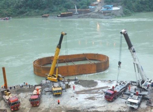首节钢围堰起吊下水 5月19日,公司武隆土坎乌江大桥项目首节钢围堰顺利下水,标志着项目一重要节点工程如期完成。 钢围堰,顾名思义是作为跨江桥梁水中墩基础施工时,作为营造干燥作业平台的围护之用,使人、机、料在基础施工中避免江水干扰、施工过程安全高效。钢围堰经设计院设计、项目部进行各项受力及锚碇系统计算、业主、监理多次赴现场讨论评审最终定案。本项目钢围堰采用双壁钢围堰,圆端型设计,中间为16×19m方形,两端为直径19m半圆,面积相当于1.5个篮球场!首节钢围堰高6m,重达120吨,需用一台300吨、一台400吨起重机合力起吊就位,水上加高后高度分别达到21m、19m,共用大小锚块10个才能将之固定于水中,最重的锚块达49吨。钢围堰是钢铁的巨兽,施工人员的守护神!其入水之时白浪翻腾,水声若雷,任水流肆虐却岿然不动,实在是让人慨叹人类智慧的伟大!围堰下水过程紧张有序,其间遇到数次技术操作难题,均在项目部的群策群力下迎刃而解,使得这一重要节点工程顺利完成。(伊硕勋)