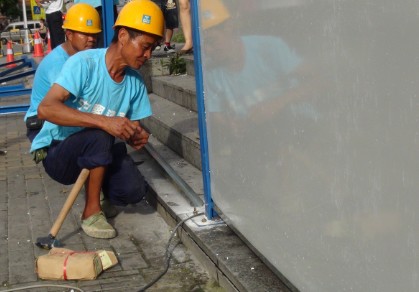 围挡施工有条不紊  德兴大厦施工围挡完成 5月27日下午15:00,公司深圳地铁项目开始人民南工区车站主体南侧德兴大厦进行临时围挡施工,经过项目全体人员共同努力,历时3个小时完成了德兴大厦一侧120m临时围挡的施工。 人民南站车站主体位于新都酒店停车场上方,起于春风路高架桥与建设路交汇处,止于春风路高架桥与人民南路交汇处,北侧有春风高架桥与新都酒店,南侧有德兴大厦和广东省银行。车站地下连续墙外边线距离德兴大厦挑出阳台的距离仅为0.6-1.2米,地连墙外侧需施工导墙(1.2米)、水沟(0.3米)、围挡(0.2米)等,施工范围已经位于德兴大厦人行过道上,围挡完成后居民出行道路宽度将减半,将对德兴大厦一楼商户,以及楼上的大型茶叶批发市场、居民等的经营和生活出行造成较大的影响,施工协调难度非常大。 在项目及工区班子的领导安排下,协调部、技术部相关人员集合深圳市地铁集团拆迁办、中建南方投资有限公司、罗湖区区委、南湖区街道办等单位力量,早早与德兴大厦物管处以及商户代表进行了一次又一次的协商讨论。我方秉承以信为本、以和为贵的思想,充分考虑周边居民及商户的感受,结合居民意见对围挡施工方案、围挡占地范围进行了多次修改,并提出了一系列的便民措施,与沿街商铺、居民各方达成了一致意见。 整个过程工区经理米永兵和工区总工邝利军全程参与、精心组织,提前安排劳务人员有条不紊进行围挡材料进场、堆放、组装、现场安放,质安部人员及时进行施工告示张贴,工程技术人员对现场经过行人及时进行交通疏导,保证了现场围挡施工高效、顺利进行。本次围挡施工经过前期不懈的协调工作,凝结了项目部全体人员共同努力的结果,也是五局以人为本、在新市场绿色施工、与环境和谐发展的体现。德兴大厦处围挡施工的顺利完成,拉开了人民南站这一复杂车站施工的序幕,也标志着全线最难车站迈开了万里长征第一步!(彭嵚)