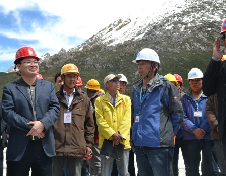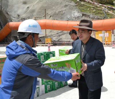 项目经理刘灿向甘孜州州委书记汇报工程施工情况  州委书记胡昌升向项目发放慰问品 5月30日下午,甘孜州州委书记胡昌升、常务副州长汪洋一行在四川俄岗公路工程建设有限责任公司总经理兼国道317线总指挥长闫平的陪同下,对公司雀儿山项目进行检查指导并对项目全体参建人员进行慰问。 首先,雀儿山隧道项目经理刘灿向胡昌升一行从施工安全质量、进度、文明施工、环保、员工生活及医疗设施配置等方面做了详细的汇报。胡昌升听取了雀儿山各项工作建设进程后,对雀儿山隧道作为世界上海拔最高的超特长公路隧道目前取得的成绩表示祝贺,对全体参建人员表示充分的肯定。 随后,胡昌升对项目全体参建人员表示深切的慰问,并来到了项目部医疗室探望高原反应人员,并且向患者发放了慰问金,祝愿患者早日康复,向患者家属表示感谢,感谢他们对雀儿山项目建设的支持。同时,胡昌升对项目建设管理工作提出了三点要求:第一,要求确保全体人员的身体健康,坚持“以人为本,生命至上”的宗旨;第二,要继续发扬中央企业先进的管理经验,对项目科学管理、合理组织,确保工程施工安全;第三,要继续肩负中央企业的社会责任,加强雀儿山隧道工程质量管理力度。 考察完现场后,胡昌升感慨道:你们这些建设人员不远千里来到四川甘孜州支持藏区建设,对甘孜州的建设事业做出了巨大的牺牲,创造了巨大的业绩,我谨代表甘孜州政府向大家表示感谢! 最后,项目经理刘灿表示将继续发扬“牺牲享受、享受牺牲、攻坚克难、使命必达”的精神,全力以赴把雀儿山隧道建设成雪域高原上“平安隧道、环保隧道。”(陈觅杭、黄滨)