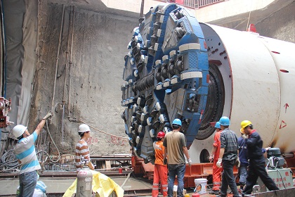 据悉,本次下井的盾构机为直径6.25米的“信和一号”盾构机,盾体加后配套设备全长80米、总重约500t,参与设备安装的操作人员及项目管理人员30余人,全套设备吊装入井及井下隧道内盾体及后配套设备组装调试耗时一个多月。自渡线隧道右线完成二衬,后配套第5、6节台车在深圳地铁9号线鹿丹村车站盾构始发井顺利下井待命,3月24日,“信•和一号”前盾顺利吊装至预定轨道,标志着五局首台盾构机进入前期的平移、组装调试阶段,4月25日项目盾构机“信和一号”完成全部组装调试任务,重达60t的刀盘顺利进行了试旋转,4月28日6环负环管片安装到位,4月30日盾构自鹿-人盾构区间右线起点里程顺利完成始发。