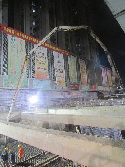 5月7日下午首件验收通过后,晚上项目就紧锣密鼓地展开混凝土浇筑工作。基坑西侧52米臂长的“天泵”越过砼支撑梁,不断往顶板浇混凝土。北侧的“地泵”通过20多米的管道,将混凝土浇至地下顶板。混凝土刚落下,马上就有工人带着振动棒将混凝土捣实。“天地双泵”时刻保持着最大功率,保证混凝土浇筑的速度。由于现场场地狭小,在浇筑前材料部和搅拌站确定混凝土罐车数,协调部门沟通交警大队确保交通畅通,一车车混凝土罐车有效组织穿梭与狭窄的场地之间。原来还是一大片裸露的钢筋骨架,渐渐被混凝土覆盖,夜幕下是一片热火朝天的景象。