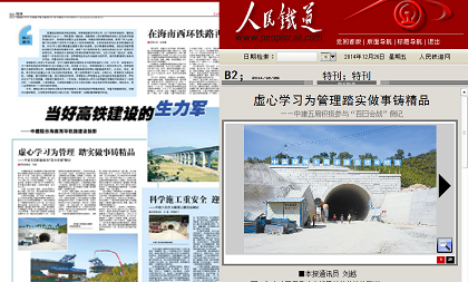 12月26日的《人民铁道》报B2版,用近一半的篇幅刊发了《虚心学习为管理,踏实做事铸精品——中建五局积极参与“百日会战”侧记》一文,着力宣传隧道公司海西项目积极开展“大干100天”活动,为海西项目百日大干助威。