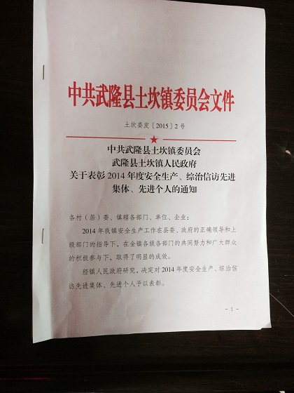 颁奖仪式  关于表彰2014年安全生产、综治信访先进集体、先进个人的通知 2015年1月16日,武隆县土坎镇党委和政府召开了土坎镇2014年安全生产工作暨总结表彰大会。镇各职能部门、5村1居委会、辖区12个企业、团体的行政负责人及安全负责人共130余人参加了会议。会议由镇长汪玫主持,镇党委书记邓伟、副镇长冯涛、陈正炉、李丹出席了会议并分别作了讲话,中建五局隧道公司武隆项目书记兼安全总监包南海应邀列席了会议。 会上,分管安全工作的冯涛副镇长在其安全工作总结报告中指出:“武隆土坎乌江大桥既是一座顺民心、合民意的民心桥,又是一座便交通、促发展的致富桥,大桥建设工程难度高、时间紧、任务重。在工程建设中,该项目业主、设计、施工、监理等单位以及广大工程建设者严格按照“争分夺秒抓进度、一丝不苟保质量、万无一失保安全”的总体要求,严格控制每一道工序,做好每一个细节,把好每一道安全关口,是我们的样本工程。中建五局作为央企,认真履行社会职责,项目部外业标准,内业规范,安全工作扎实稳步推进,为我们安全工作树立了标杆,为我镇的安全稳定工作作出了积极的贡献。土坎乌江大桥工程必将是武隆的精品工程、安全工程、民心工程和经得起历史检验的德政工程”。 会上,汪玫镇长宣读了《中共武隆县土坎镇委员会、武隆县土坎镇人民政府关于表彰2014年度安全生产、综治信访先进集体、先进个人的通知》。武隆项目项目书记兼安全总监包南海同志荣获土坎镇2014年度“安全生产先进个人”殊荣,镇党委和政府颁发了荣誉证书和奖金。(文/武隆项目:张少飞)