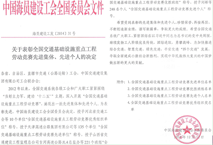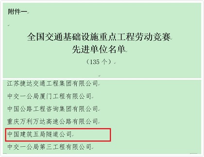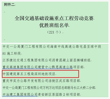 表彰文件  全国交通基础设施重点工程劳动竞赛先进单位  全国交通基础设施重点工程劳动竞赛优胜班组 近日,中建五局隧道公司在深入开展“全国交通基础设施重点工程劳动竞赛”活动中,获得中国海员建设工会全国委员会授予的“全国交通基础设施重点工程劳动竞赛先进单位”、“全国交通基础设施重点工程劳动竞赛优胜班组”两项大奖。 隧道公司作为五局基础设施的排头兵,始终坚持专业化和区域化,围绕“工期、质量、安全、环保”四大目标,充分调动广大员工的积极性,依托重点工程开展不同主题、不同层次、不同工种的劳动竞赛和职工职业技能大赛。其中渝黔项目开展了“超英”杯劳动竞赛评比,实行了“4+2”工作法管理制度,对完成任务优秀单位及个人进行表彰奖励,进一步调动了项目全体员工大干快上的工作劲头,多次获得遵义市政府、市总工会、市环保局等多家单位的好评;南宁项目通过死盯严守、凝心聚力、精细计划、确定完成时间,24小时奋站坚守,仅用了8天“信和三号”盾构机在南宁地铁项目实现全线首发,提前业主工期节点,做到了“当年进场、当年开工、当年始发”,是南宁地铁建设史上的又一重要里程碑,得到业主和相关方的高度赞誉;海南西环铁路项目则在百日大干中严格执行“零耽搁、负交接、谁耽误、谁负责”的工作制度,为项目创造了大干快上的良好局面,首次利用既有线进行区间卸轨,并最终以比原计划提前整整两个小时的速度完成了卸轨等。 荣获“全国交通基础设施重点工程劳动竞赛优胜班组”的深圳地铁项目,其鹿丹村站在全线22个车站主体结构中首个完成封顶,仅用了6个月时间,比计划节点工期提前了78天,创下了深圳地铁主体施工最快纪录,中国建筑时隔30年,由五局隧道人再创“深圳速度”。与此同时,深圳项目还定期组织了劳动竞赛、安全教育交底、质量宣传月等活动,积极开展“大干120天”争先创优竞赛、争创样板工程、各项危机应急演练、工程创优方案征集活动,在工人先锋号活动的激励下,自开工以来,项目部涌现12名先进工作者、5人次受到业主表彰,累计获奖300余万元,并屡获中建南方公司劳动竞赛节点奖等多项第一。 劳动竞赛成为隧道公司推动企业自主创新、提高企业核心竞争力、形成新的经济增长点的重要途径,同时也使职工技术技能、综合素质、经济收益得到提高,全年累计获得业主通报表扬20余次,获得业主奖励近400万元。 此次全国交通基础设施项目劳动竞赛重庆仅五家单位获评“先进单位”、隧道公司就是其中之一,也是此次重庆在渝中建系统中唯一获奖单位,公司将会不断研究和探索新常态下围绕“三心”(维护核心、服务中心、凝聚人心)更好地开展工作的新方式、新方法和新举措,为企业发展积蓄正能量,为早日实现百亿隧道而奋斗。(赵澳瑶)
