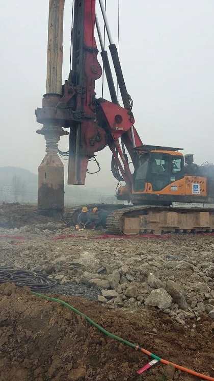 旋挖钻机施工现场 经过连续两天的“奋战”,在怀邵衡铁路项目二工区全体同志的协力配合下,克服了各种困难旋挖钻机已于1月27日上午9:30在胡家屋2#大桥10-4#桩顺利开钻,给严冬期间奋斗在一线的全体员工以极大的鼓舞,同时也意味着二工区施工进度的快速提升。 由于旋挖钻机属于大型工程机械机体长且吨位大,旋挖钻机进入村道之后路况急转直下,蜿蜒狭窄而又脆弱的村道上进场异常困难,村民担心村道在旋挖钻机进场过程中遭受破坏,导致旋挖钻机进场时在村道上历经多次村民阻工,经协调部同志积极配合进行多方协调与村民沟通,得以解决。由于村道狭窄旋挖钻机主体转向不便,两侧树木钩挂机械,为防止机械挂碰导致机器零部件反复装卸,终于将机器运送至现场,同时为了旋挖钻机能够及时的进行钻孔施工,施工现场预先搭设了施工平台及旋挖钻机组装平台,然后就是紧锣密鼓的组装,于今日终于具备了开钻条件,在胡家屋2#大桥10-4#桩顺利进行首钻。 随着第一声鞭炮声响起,旋挖钻机轰隆隆的开动啦!旋挖钻机的开钻不仅体现出我部各部门团结合作日益成熟,同时也意味着我部施工进度的快速提升。相信在各级领导的关心和帮助之下,怀邵衡项目部二工区全体员工一定努力工作、积极配合,为工程的高质量、高水准、高速度完成奉献出自己的工作热情和智慧。(文/怀邵衡铁路项目:唐张斌)