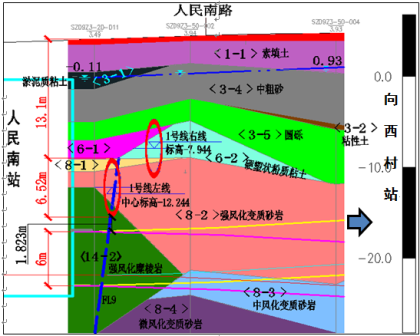 地铁9号线与1号线地质图 隧道公司深圳地铁9104-2标左线“信和二号”盾构机于2014年12月4日破除人民南车站东端头连续墙后,经过3天的艰苦掘进,紧随右线步伐,于2014年12月7日再一次成功下穿深圳地铁1号线。这是全体深圳“地铁人”努力奋斗的结果,亦是中建五局在地铁领域的又一次重大突破。 深圳地铁1号线是深圳市目前正在运营的地铁线路,是深圳市主要交通线路,列车运行频率高,人流量大。深圳地铁9号线人民南站~向西村站区间线路中,盾构机出人民南东端头后即下穿地铁1号线(罗湖站~国贸站)盾构隧道。距离人民南站东端头最近处10.3m。地表为人民南路与春风路交汇处,交通繁忙,车流量大。盾构下穿时距离地铁1号线最小净距1.823m,隧道间距较小,下穿地层为强风化变质砂岩、强风化糜棱岩,地质条件极差,对盾构施工要求极高。 下穿地铁1号线具有“始发即穿越、穿越净距短、地质极复杂、控制标准高”四大难题。为确保顺利下穿,深圳地铁9104-2标具体定制“精心策划、紧密组织、充分准备、适时调整、积极抢险”五项下穿战略措施。可以说,成功下穿地铁1号线是深圳地铁9104-2标经过充分准备的必然结果。 在成功穿越深圳地铁1号线之后,“信和二号”盾构机将进入更加复杂的地层掘进,更大的困难等着我们去挑战。漫漫征程已经过半,面对切削春风高架桥桥桩、重叠隧道施工、右线常规接收、左线叠线接收以及盾构机吊拆等难题,我们将继续发扬深圳“盾构人”的艰苦探索,勇敢奋斗的精神,用我们的实力和汗水去征服深圳这片土地! (文/隧道公司深圳地铁项目:张群群)