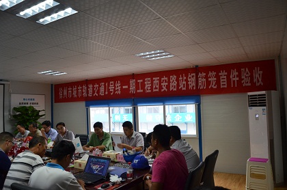 2015年8月7日,徐州地铁03标西安路站施工现场人头攒动,彩旗飘扬。由徐州市轨道公司工程部、安质部、广州地铁设计研究院、中铁济南工程建设监理公司等多家单位组成的钢筋笼验收组对西安路站B-13钢筋笼进行了首件验收,验收组通过看现场、查资料、听汇报,对西安路站首幅钢筋笼B-13工程内外业情况进行了全面检查,一致认为首幅钢筋笼钢筋布设及焊接工程质量满足设计及相关规范要求,验收过程符合监理工作流程,同意通过验收。