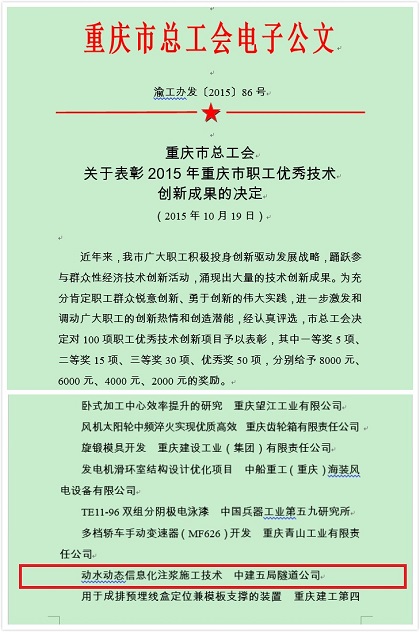 获奖文件 近日,隧道公司工会在推动“大众创业、万众创新”、“科学发展、富民兴渝”的职工群众性经济技术创新活动中,积极参加2015 年重庆市职工优秀技术创新成果评选并脱颖而出,其中公司的《动水动态信息化注浆施工技术》获得重庆市职工优秀技术创新成果优秀奖。 《动水动态信息化注浆施工技术》在隧道公司中梁山项目等工程中的应用,创造了在长大复杂山岭隧道 “零伤亡”攻坚奇迹;保持了地下水和地表水的动态平衡,控制了隧道水体大量流失对周边环境的严重影响,达到了限量排放(<1m3/d.m)标准,确保了居民生产生活用水。有力的保证中梁山隧道安全按期贯通,确保重庆市轨道交通一号线的按期运营。该研究成果广泛适用于当前岩溶高压富水隧道施工,解决了重庆片区岩溶富水隧道突水突泥注浆施工难题,为国内类似工程施工提供科学可靠的施工参数。同时为企业、社会培养出一大批高素质的专业注浆技术人才,对推进全行业的技术进步有着深远的意义。 据悉,隧道公司一直致力于培育一支争当知识型、技术型、创新型的高素质劳动者的创新人才队伍。结合公司“三创计划”的相关内容,遵循人才培养“721”规律,为员工搭建交流平台,从中发现一批在创新创效中所涌现的典型经验和先进做法,积极带领员工创新创效,再接再厉,不断创造更多更好的技术创新成果。(文/隧道公司:赵澳瑶)