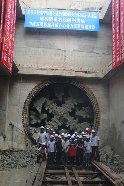 巨龙出洞 众人合影留念 巨龙出洞,捷报频传!月初“信和”三号破洞的余音还在,11月18日上午10时许,“信和”五号也不甘落后,从安西区间右线腾空而出。至此,隧道公司盾构分公司南宁地铁2号线安西区间左右两线相继在11月中上旬整体实现贯通。 安西区间右线长度共计513环,区间土质情况复杂,包括上软下硬地层、软基地层等有名的“拦路虎”,掘进参数不易控制,施工难度和施工风险陡然增大。然而,这些纸老虎并不能阻挡住南宁地铁项目西津工区全体员工克服万难的决心,工区领导班子和技术人员众志成城,对掘进过程中的各项参数进行分析和总结,优化同步注浆配合比,加强地表沉降监测力度,“拦路虎们”被各个击破! 在9、10月份迎接南宁轨道交通2号线公司的检查中,南宁地铁西津工区连续斩获“百环无错台无渗水无破损”质量奖!此次安西区间右线的顺利贯通,既是对工区全体工作人员孜孜不倦和默默奉献最好的回报,也是献给局庆的一份贺礼! 安西区间左右两线在11月中上旬争相贯通,不但承载着老一辈员工的期许,更重要的是成为一大批青年员工长知识、学技能、强自我的大舞台!安西右线贯通之后,“信和”五号盾构机将经过拆解、运输、吊装、清洗,继续奔跑在崭新的道路上,载着五局的盾构事业昂首阔步、跃马扬鞭!(文/隧道公司盾构分公司南宁地铁项目西津工区:周淼洋)