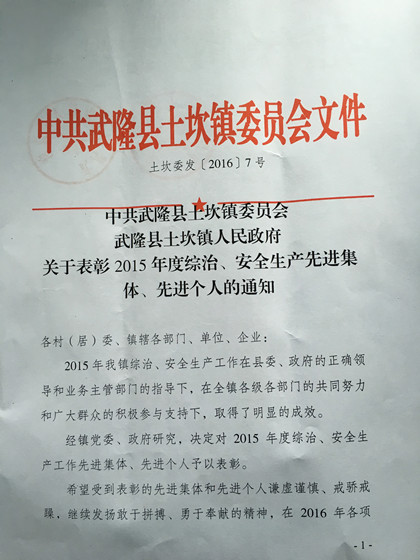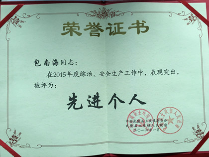 上台领奖  表彰红头文件  荣誉证书 2016年1月15日,武隆县土坎镇党委、政府召开了2015年综治、安全生产工作年终总结会。会上,隧道公司武隆土坎乌江大桥项目书记兼安全总监包南海荣获“2015年度综治、安全生产先进个人”。土坎镇党委副书记、镇长史禄科为其颁发荣誉证书及奖金。以包南海为代表的武隆项目取得此次殊荣,不仅是对2015年度土坎乌江大桥在安全工作的高度肯定,更是对2016年的安全工作寄予期望。 在局、公司及当地县、镇政府的正确领导下,在项目领导班子及全体员工的努力下,工程项目实现全年零伤亡事故,各方面达到年初公司及当地县、镇与我部签订的安全生产责任目标。土坎乌江大桥是武隆县头号工程、民生工程,也是五局的战略工程和重点工程。中建五局作为央企,认真履行企业主体责任,积极做好综治和安全隐患排查治理工作,努力响应属地市、县、镇各级政府的安全工作要求,主动承责、认真履责,在安全生产工作方面树立了标杆,塑造了形象,确保了零伤亡的安全生产目标,为项目带来了安全效益。 目前,武隆项目3#、4#主墩现已进入挂篮施工,安全风险高,管控难度大,安全生产工作任重而道远,项目部将一如既往的高度重视安全,警钟长鸣,不折不扣狠抓安全工作,争取早日向武隆县及局呈交一份满意的答卷。(文/隧道公司武隆项目:张少飞)