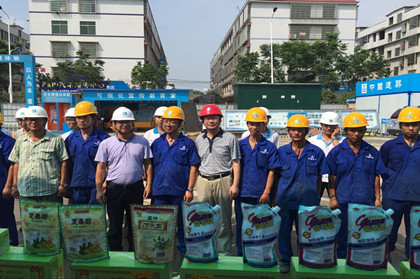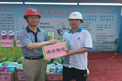 隧道公司总会计师、工会主席苏立强给汉王陵公园站管理人员发放清凉物资  大家一起合影留念 7月的长沙正式迈入了蒸笼天,夏日炎炎,骄阳似火。为保障一线作业员工的身体健康和施工安全,7月9日下午,隧道公司总会计师、工会主席苏立强来到长沙地铁4号线汉王陵公园站,为在高温酷暑下坚持工作的工人们送来防暑降温物资和清凉物资。 隧道公司工会主席苏立强对奋战在一线的工人表示亲切的慰问,并嘱咐大家多关注气温,合理安排工作时间,紧接着将西瓜、王老吉、藿香正气水、葡萄糖等防暑降温物品亲自发放到一线职工。当防暑清凉物资送到施工现场,送到工人的手中,送到职工的心里时,让施工生产一线的我们感受到了夏日的一片“清凉”。一句句关心的话语,一袋袋清凉降温的药水,一声声亲切温馨的问候到表达了隧道公司领导对我们的深切关怀。拿到清凉物品的工人感慨地说:“在这炎炎夏季给我们送来清凉解暑的药品和饮品,就是对我们最真挚的关心”。感谢隧道局领导和分公司领导对我们的关心和慰问,您们把夏季的清凉送到了我们的手中,让我们非常感动,真是清凉在口,滋润在心,我们的干劲更足了。 慰问结束后,苏总在盾构分公司总经理夏一夫、总会计师兼党总支副书记蔡锦义的陪同下,参观了汉王陵公园站标准化施工现场,观看了盾构机掘进的情况。整洁的施工场地、到位的安全措施及规范有序的作业场面得到了苏总的称赞。(文/隧道公司盾构分公司:雷密红)