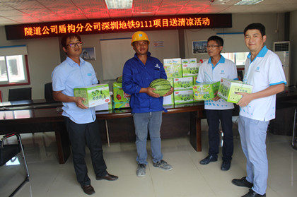 清凉物资发放到劳务人员和管理人员手中 夏日炎炎送清凉,爱意满满暖人心。隧道公司深圳地铁9111标项目积极响应公司号召,于7月17日下午在项目经理罗德静及项目班子成员李正书、王军、邵云的组织下开展了“送清凉 送健康 送安全”活动。 为确保安全作业,加强防暑降温,保障施工人员的身体健康。深圳地铁9111标项目为现场施工人员、后勤人员发放金银花露、板蓝根、藿香正气液、西瓜等防暑解暑的物资。在“送清凉”活动中,机电总工李正书亲手把物品送到施工人员手中,并叮嘱大家,深圳高温天气仍将持续,要严格落实现场作业安全措施和防暑措施,营造一个安全的良好的施工环境,同时要抓紧工期、加快施工,高效生产。 “送清凉”物资的发放,不仅为施工人员送去了降暑的物资,也是送去了的温暖,代表了公司对施工人员的关怀。(文/隧道公司盾构分公司深圳地铁9111项目:张秀洁)
