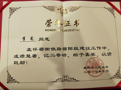 表彰会上,市政协副主席、市铁路建设协调指挥部常务副指挥长周晓红对参与怀邵衡铁路建设的各单位表示感谢,并对在铁路建设中贡献突出、成绩显著的优秀个人进行了表彰,其中,怀邵衡项目常务副经理李龙荣获二等功,张宏伟、李春富荣获三等功,朱棣鹏、杨长寿等8人获先进个人。