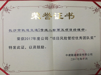近日,在中建隧道组织召开的履约项目经验分享专场会议上,长沙地铁5号线项目部获得中建隧道2017年“项目风险管控优秀团队奖”。