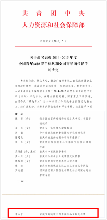 李金求 全国青年岗位能手获奖文件 青春五月,隧道公司建功“三创”,筑梦五局;激情五月,隧道公司青春榜样,励我前行。公司团委仅5月分,力揽6项大奖——盾构分公司副总经理李金求荣获共青团中央授予的“全国青年岗位能手”、汶马项目王晓梅荣获“重庆市优秀团干部”、公司冯艳荣获“重庆市青年岗位能手”、渝黔项目熊雅丽荣获“遵义市优秀团员”、长沙4号线、渝黔项目荣获“重庆市五四红旗团支部”。重庆仅十一位青年获评,李金求就是其中之一,是此次重庆在渝中建系统中唯一获奖个人,也是继2014年公司彭继勇荣获“全国青年岗位能手”后的又一全国奖项。 隧道公司团委高度重视青年人才的选拔、培训培养,以“人人皆可成才”为团队建设理念,以“活力隧道”、“活力青年”为主题,以新形势下深化党建带团建工作、更好地凝聚和服务广大青年为目标,着力打造“创新机制 凝聚团队”的共青团品牌建设。并将优化组织建设提高服务水平、思想引导凝聚青年融入中心、综合培养助力青年成长成才、三创计划激发青年工作热情、联动共建搭建青年区域平台五大板块助力青年成长,打造一支专业素质过硬的隧道青年人才梯队。 实现“五局梦”,要依靠青年,也能成就青年。隧道公司团委以更加饱满的热情、更加务实的作风和更加显著的成果,服务青年、服务企业,谱写五局青年“敬业”、“乐业”、“立业”的新篇章!(文/隧道公司:赵澳瑶)