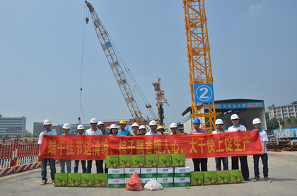 溁湾镇站地铁建设者端午节合影  周阳为土石方队伍送粽子 如火如荼五月艳阳天,又是一年粽子飘香时。 隧道公司长沙地铁4号线项目正进入主体施工大干快上施工阶段,现场施工员及劳务工人们传统佳节不休假,为地铁建设坚守岗位。项目执行经理周阳带领项目班子成员为溁湾镇站的主体结构、钢支撑、土石方等劳务单位送去了端午佳节的关心和施工安全的嘱咐。一箱箱清凉的矿泉水、一个个浓香四溢的粽子、一个个清洁秀美的咸鸭蛋以及防暑降温物资让坚守一线而辛勤付出、甘于奉献的地铁建设者们倍受鼓舞。 周阳指出:溁湾镇站全体参建人员正全面攻坚,希望各劳务队伍与项目部加强沟通、敏捷施工,通力协作为项目突破节点,实现8·30节点目标实现优质高效履约共同努力奋斗。(隧道公司长沙地铁4号线项目:谭梓妮)