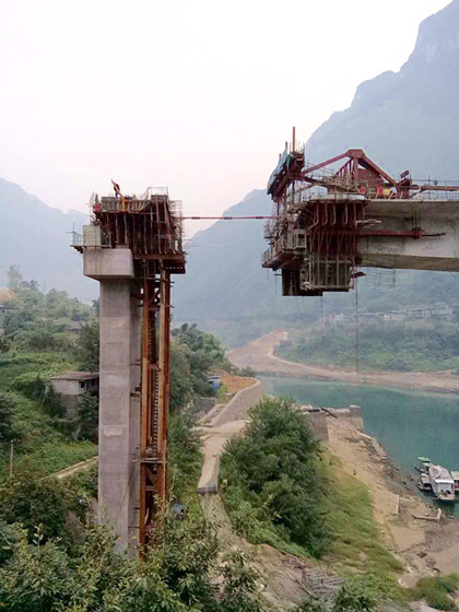 现场施工图 武隆土坎乌江大桥合拢在即,武隆县委、政府、业主及全县人民翘首以望。为工程项目的全线完成,项目部全体员工白天黑夜抢工期、抓进度,出现了很多可歌可泣的感人之篇。 土坎乌江大桥5#墩高支架混凝土浇筑,经过四十多天坚苦施工,终于完成高架、模板、钢筋、预应力等各项工程的验收,进入到混凝土浇筑最后一道工序。本次混凝土浇筑、高支架垂直高度约40米,浇筑量150立方米。为确保最后的混凝土浇筑安全顺利进行,项目部领导对高架,支模亲自进行验收,指出整改意见,并联系相关的外援。 武隆土坎乌江大桥工程,因体量小,项目单一,资源配置时未自设拌合站,也没有臂架混凝土泵车。遇高架桥混凝土施工时,项目部均要提前联系相关外援提供支持。 时值2016年9月23日,工地日志如下: 1.外援拌合站中铁八局,答应仅今天供应混凝土,过了今天 不浇筑,再排队到何时不知; 2.已联系好的外援臂架泵车到场后高度不够。足够高的泵车 也要过两天才能提供; 3.再联系第二家臂架泵车的单位,条件苛刻,漫天要价,但 即使如此,最快也要24日下午。 怎么办?怎么办?困难吓不到英雄汉!面对自身困难和 外界的夹制,项目部全体员工及劳务分包队全体人员心往一处想,劲朝一处使,奇迹出现了! 项目部项目经理赵湘龙下令,因地制宜,今天必须浇筑混凝,气壮山河,掷地有声。工程技术部副经理刘申申,同时也是5#墩现场施工负责人,敢想敢干,勤学好问,大胆提出了:从边跨段的挂篮飞架12米空间混凝土泵管至5#墩,并对细节问题与项目领导及技术顾问商议,确定后,坚决实施! 项目施工员与劳务队班组,通过下午5个小时的努力,在没有的吊车的情况下,终于将混凝土泵管从边跨飞跃12米接至5#墩作业面。 晚上八点,混凝土作业顺利安全进行! 项目全体员工笑啊,劳务队全体员工笑啊,困难吓不到英雄汉!笑到最后,才是胜利的!(文/隧道公司武隆项目退休返聘老同志:张毓华)