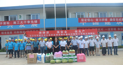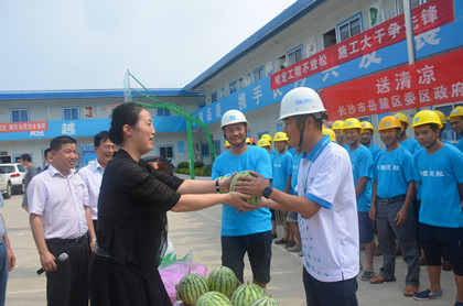 岳麓区委副书记、区长刘汇送清凉物资  合影 8月9日,长沙市岳麓区委副书记、区长刘汇一行赴隧道公司长沙地铁4号线溁湾镇站,为项目部及农民工送上了纱手套、夏桑菊、十滴水、西瓜等防暑降温物资,长沙地铁4号线一标指挥部常务副指挥长彭鸿志、党委书记兼副指挥长欧阳志、隧道公司副总工程师兼项目常务副经理柳伟陪同。 “天气炎热,你们战高温、斗酷暑,加班加点、日夜施工,希望你们更要保重身体,工作身体两不误,安全生产,按期完成建设任务。中建长沙地铁4号线和岳麓区建立了良好的合作,我们为河西交通建设共同努力,今后你们遇到困难,我们一起解决!”刘汇的一席话使溁湾镇站项目全体员工及农民工人们在夏日感受到一种发自心底的如春风般的温暖。 随后,柳伟向刘汇介绍了溁湾镇站工程概况:溁湾镇车站要确保今年9月30日盾构始发,溁湾镇站全体参建人员将发扬顽强拼搏、攻坚克难的精神,保质保量完成施工任务,展现中国建筑的社会责任和使命担当,为长沙地铁建设努力奋斗。(文/隧道公司长沙地铁4号线项目:谭梓妮)