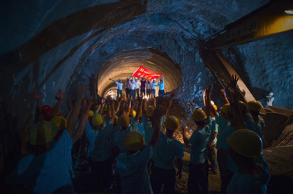 8月11日上午,在成渝高速中梁山隧道扩容改造项目一标段和二标段的分界点处,随着挖掘机对洞内掌子面的最后开挖,标志着项目的主隧道全面贯通。在隧道公司新中梁山隧道左洞施工现场,监理、代建、建设等参建方相关负责人、项目管理人员和施工作业人员举旗欢呼,共同见证这期待已久的时刻。