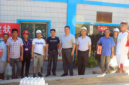武隆县交委“送清凉”到土坎乌江大桥项目合影  武隆县交委邱书记“送清凉”到土坎乌江大桥项目 酷暑盛夏,热浪滚滚,未来十天,重庆市各区县将遭受持续高温袭击,值此隧道公司武隆乌江土坎大桥项目如火如荼大干之际,武隆县交委书记邱小丘带队给奋斗在一线的建筑工人们送来了一片清凉。 2016年8月15日,武隆县交委送清凉队伍来到武隆项目部,带着业主的关怀,给工作在一线的农民工兄弟们送来了西瓜、矿泉水、藿香正气液以及凉茶等防暑物品。炎炎夏日,挡不住大家的积极和热情,农民工兄弟们看着领导们湿透的衣服,听着领导们一声声“辛苦了”的慰问,吃着清凉的西瓜,眼里满是感动。 离开之前,邱小丘详细询问了农民工兄弟们的工作和生活情况,叮嘱大家一定要注意防暑,保重身体,并要求项目部做好食堂的饮食卫生、现场的防暑降温以及员工们疾病防疫工作,加强各部位隐患排查,加大对工人防暑降温和中暑急救安全知识教育培训力度,确保安全施工。 项目经理赵湘龙代表所有作战在土坎大桥的施工人员向领导表态:项目将严格按照县交委要求,认真做好防暑降温工作,合理安排作息时间,避开高温时间段,切实保障职工安全健康,做最后的拼搏冲刺,争取在元旦前向武隆人民交付一份圆满答卷。 炎炎夏日,“送清凉”活动虽不能彻底解决闷热环境,但给长期生活在相同环境,已接近麻木的作业人员提了个醒,要时刻保持警惕、重视安全,像在沙漠里为他们冲了个冷水澡,洗去了前路的疲惫,重新满状态出发。(文\隧道公司武隆项目:肖鹏)
