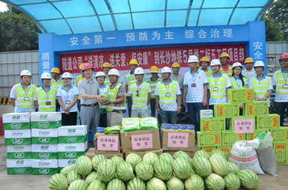 副总工夏宇接受长沙市新闻频道记者采访  为农民工送上西瓜 “这种天气,出了空调房都有被灼伤的感觉。” “我和烤肉真的就差一撮孜然了,快晒化了……” 7月份,长沙持续高温天气,最高气温高达39℃,地面温度高达50摄氏度,“奔走的五花肉”模式成为不少市民吐槽的热点。当人们纷纷避着太阳和高温,躲进室内吹空调,猫在树荫下纳凉,或跳进泳池里嬉水时,有一群城市建设者们却依然顶着烈日的暴晒和热浪的侵袭在工地坚守着。 隧道公司长沙地铁5号线蟠龙路车站施工现场,作业工人每天有条不紊进行施工。他们顶着烈日穿着厚厚的衣服,防止被晒伤,拎着水壶,开始了一天的工作;他们顶着烈日扛着发烫的钢筋去绑扎;他们顶着烈日推着斗车去铲灼热的沙土;他们顶着烈日粉刷墙面;他们顶着烈日……走进施工现场你会发现,现场的作业工人无不被太阳焦灼成了“黑人”,每天挥汗如雨只为保证工期节点保质保量的完成。 施工现场的农民工说:“太阳那么大,晒久了真的很难受。每天都要喝十几大杯水,流的汗也够几大杯了。但是项目部很贴心的安排避开最热的时间上班,还给我们发放防暑物资,而且现场管理人员也都是顶着酷暑跟我们一起坚守在施工现场,心里很感动,相信我们一定会齐心协力,把事情做好的。” 烈日焦灼、酷暑难耐,为防止现场高温作业人员中暑,隧道公司长沙地铁5号线项目部积极筹划、周密安排,迅速启动防暑降温措施,确保高温高热天气下,员工作业安全。项目部采取工人错峰施工、定时发放防暑物资、积极开展“夏日送清凉活动”、每日洒水降温降尘、启用喷淋防护系统等措施。有效的减轻了作业工人中暑事件,保障了作业工人的身体健康,并保障了工期节点保质保量的完成。 持续的高温天气,项目的防暑降温措施吸引了多家新闻媒体的密切关注。先后,湖南卫视午间新闻、长沙新闻、湖南卫视晚间新闻来到隧道公司长沙地铁5号线项目针对高温作业的防暑降温措施进行专访。项目部高效的降温措施,得到了各界媒体的关注与肯定。 八月已至,长沙高温天气已过一半。盾构分公司长沙地铁5号线项目部会一如既往的保证防暑降温措施的实施,并加强实施力度和实施方法的应用,保障高温作业人员工作中身体和心理上的舒适,我们与高温作业工人在一起“抗日”战胜长沙酷热天气。(文/隧道公司盾构分公司长沙地铁5号线项目部:刘静)
