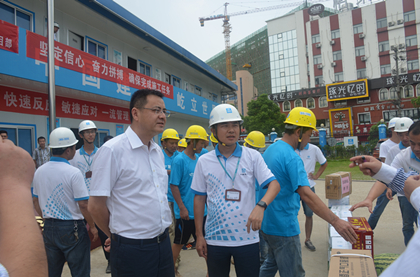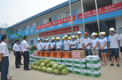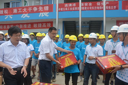 江森为工友送上清凉物资  江森慰问项目员工及工  江森询问项目施工情况 “送清凉、送关爱、保安康”,8月24日,局党委副书记、纪委书记、工会主席江森、安全总监杨程荣、工程管理部经理胡格文、基础设施事业部副总经理戴华良以及局工会委员会代表一行送“清凉”到隧道公司长沙地铁4号线溁湾镇站,长沙地铁4号线一标指挥部党委书记兼副指挥长欧阳志、隧道公司副总工程师兼项目常务副经理柳伟陪同。 江森一行亲切慰问了项目部及农民工友,嘱咐他们在高温天气下,保重身体,安全生产,还送上了凉茶、藿香正气水、西瓜等防暑降温物资。 溁湾镇站是整个长沙地铁4号线一标的命脉,为地下四层(局部三层)岛式站台车站,工程量大、施工工期紧张,是全线技术难度最大,目前溁湾镇车站抢930节点目标,南端头在9月30日前要具备盾构始发条件。项目负责人柳伟介绍了项目工程概况及施工重难点后,江森对溁湾镇车站项目管理团队给予了高度肯定。 江森一行的到来极大地鼓舞了溁湾镇车站参建全员的士气,全员表示一定会狠抓工程进度,保质保量完成节点施工任务。(隧道公司长沙地铁4号线项目:谭梓妮)