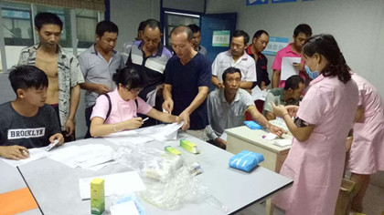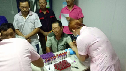 护士正在为劳务工人抽血  体检现场 2016年8月29日,为建立施工队伍工人健康备案,提高工人的工作生活质量,贯彻落实“以人为本,拓展幸福空间的”理念,在项目部的牵头下,隧道公司龙洲湾项目三分部为隧道劳务人员组织开展了一次“幸福生活,健康工作”为主题的健康体检。 华康医院的医生护士便早早来到工地,鲜红的朝阳辉映着护士们穿着的粉红色护士服,像是盛开在我们龙洲湾朵朵美丽的樱花。她们在劳务队会议室进行体检的准备工作,抽血针、试管、血压计、听诊器等等健康体检设备一应俱全。为保证健康备案的完整性、可靠性,所有的隧道劳务人员都进行了健康体检。 上午7点20分左右,工人们有条不紊的开始进行健康体检,大伙对自己的健康状况都十分关心,每个人都积极配合护士工作。十二名护士悉心的为工人们抽血、测血压、验心肺功能。她们专业的服务,甜美的微笑,让辛勤工作的工人们感到贴心的温暖,也在炎炎的夏日显得格外的清凉。70多名劳务工人,70多支验血试管,70多颗热血澎湃跳动着的心脏,70多双建设着龙洲湾的勤劳的手,70张朴实憨厚的劳动人民的笑脸,他们的健康是我们最应该保证的。 体检进行了两个半小时,护士用自己的专业为工人保障健康,用自己的笑容让工人感受温暖。微风吹过,轻轻拂走龙洲湾里朵朵的“樱花”,留下的是工人们爽朗的笑声,见证的是项目部对工人们强烈的责任心。(文/龙洲湾项目:郭云飞)