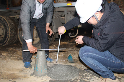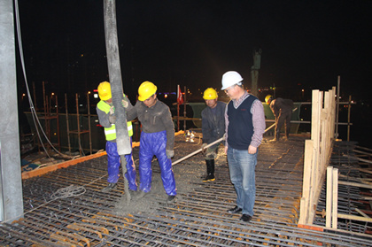 测量坍落度  深夜浇梁 在我眼里,他们是一群“汉十”人,一群与众不同的汉十铁路人。 办公室里他们挑灯夜战,一丝不苟做方案;工地现场他们挥汗如雨,马不停蹄赶工期。 一顶顶白色的帽子把施工安全系于心中,一块块黝黑的皮肤是他们勤恳拼搏的见证。 朴实的面庞露出的洁白的牙齿是他们倔强的笑容,健步如飞的脚步是他们奔波的身影。 他们,就是我们汉十铁路项目的脊梁! 看,快看,这是他们的工作时间! 上球铰安装因滑板(超高分子量聚乙烯板)受温度变化影响大,安装温度宜控制在25摄氏度以下,所以他们安装就在凌晨3点开始;为保证施工进度,夜晚12点的灯光下,他们还在坚守岗位,浇筑混凝土。 看,快看,这是他们的工作难度! 作为五局第一个转体连续梁,他们迎难而上无畏惧,小心翼翼负重责。球铰和接触球面光洁度不小于▽3,球面各点处曲率务必相等,其误差≯2mm;球铰边缘各点的高程差≯1mm水平截面椭圆度≯1.5mm ;下球铰内球面各镶嵌四氟板顶面应位于同一球面上,其误差≯0.2mm; 看,快看,这是他们的工作强度! 他们与时间赛跑,与暴雨搏击,与骄阳抗争。仅用五个半月的时间,他们完成了从桩基承台墩身、26榀现浇梁的施工任务,让孝感东站从一片鱼塘成为具备铺轨条件的高速铁路高架站,刷新了中国建筑高速铁路建设新时速,为业主提交了一份满意的答卷。 他们,演绎了十汉的传奇! 辛勤工作不问寒暑,让天堑变通途,克难而上不惧风雨. 这就是钢铁铸造的汉十铁路人!我眼中的汉十工程部,项目的中流砥柱!(文/隧道公司汉十铁路项目:李林谱)