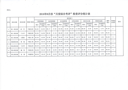 8月份综合考评检统计表 9月1日,隧道公司长沙地铁4号线汉王陵公园站在2016年8月份中建轨道交通四号线一标工程指挥部综合评比中获得全线第一名的好成绩,这也是项目部继7月获得后、8月再次获得此荣誉。 汉王陵公园站进场以来,在局、公司以及指挥部的正确领导、项目全体员工的共同努力之下,科学筹划,克难攻坚、奋勇向前,以严谨的目标,严格的管理,强势推进项目施工的建设,一直在不断超越,始终以领头羊、排头兵的姿态引领全线。 隧道公司长沙地铁4号线汉王陵公园站坚持以“安全有保障,质量上台阶”作为开展工作的基本准则,正努力将汉王陵公园站持续打造成全线优秀站点,项目全体员工亦将以优秀的精神面貌完成工作任务,以优异的成绩来回报长沙市民的期待。(文/隧道公司长沙地铁4号线项目:凌志)