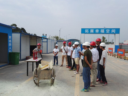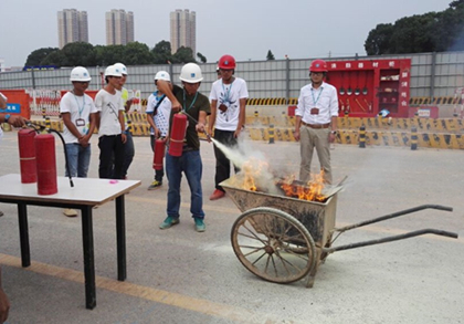 王勇讲解灭火器的用法  新员工现场体验干粉灭火器 2016年9月4日15点45分,隧道公司盾构分公司长沙地铁5号线蟠龙路站施工现场突然发生“火灾”,火苗瞬间蹿到人的高度,项目部立即启动消防救援机制……为加强项目的日常安全工作,提高新员工的安全消防意识,安全防范的能力,开展以“安全生产·预防为主”为主题的应急安全演练活动。 8月25日,蟠龙路站北端进入土方开挖阶段,车站南北两端统一战线;8月30日,项目部南端浇筑完成第一段底板,车站进入主体结构施工阶段。目前,项目大干快上的局面已全面形成,在保障工程质量安全方面也提出了更高要求。 下午15:30,演练活动正式开始。 本次演练负责人王勇向新老员工传授消防意识要点:第一,平时一定要保持良好的消防安全习惯,禁止将火种带入施工现场、物资仓库等人员和材料聚集的场所,从根源消除火灾隐患。第二,119是我国的火警求救电话,当有火灾发生时,应第一时间拨打火警求救电话向火警求救。第三,面对火灾一定要冷静、镇定、不慌乱,采取正确的自救、求救措施。王勇还讲解了有关火灾现场的应急处置方案,灭火器的使用原理以及相关的注意事项,并亲自演练了灭火器的使用方法。 在认真听讲及观摩后,全体新员工们亲自体验了现场灭火过程,面对熊熊燃烧的火堆,新员工们表现的十分沉着,熟练地按照灭火的步骤和方法,将木柴燃起的浓烟大火成功的迅速扑灭,做到了冷静沉着的面对突发现象,成功快速的扑灭大火。最后,在引导人员的指挥下大家依次离开了空地,本次演习圆满结束。 通过消防知识的培训和现场模拟演习,对新员工的消防意识和安全技能有很大的提高,为现场施工营造一个安全和谐的环境。演习过程中,在演练负责人的指挥下,新员工不慌不乱,反应敏捷,技能娴熟,出色的完成了预定科目的演练。整场演习过程安排合理,人员组织紧张有序,灭火动作迅速有效,我们在不仅充分学习消防知识,实地演练灭火过程的同时更锻炼了快速果断处理突发事件的能力和团结协作的精神。(文/隧道公司盾构分公司长沙地铁5号线项目部:刘当当、何小飞)