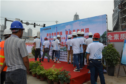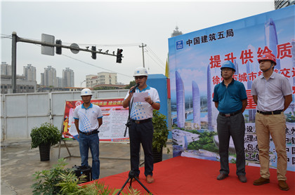 全体人员在背景墙上签字  袁晏仁在仪式上发表讲话 根据国家质检总局办公厅《关于印发贯彻实施质量发展纲要2016年行动计划的通知》(质检办质函〔2016〕575号)要求,深入贯彻实施《质量发展纲要(2011—2020年)》,推进建设质量强国,近日,在徐州地铁1号线彭城广场站,03标、04标开展了“质量月”活动启动仪式,此次“质量月”活动主题为:提升供给质量,建设质量强国。 9月为全国质量月,为提高所有管理人员质量意识,加强现场质量管理,特开展此次活动,活动仪式上,由隧道公司副总经理兼徐州地铁项目经理袁晏仁发表讲话,宣传质量月的主题。以袁晏仁为质量小组组长,带领大家对现场施工质量的监督和管控,现场施工严格执行“三检制”,每道工序的质量责任落实到人,让大家严把质量关。质量是企业的生命,为加强质量的宣传和学习,我部将会加强新规范的学习,培训宣贯地铁施工工艺。 “质量月”活动启动仪式上,由徐州市城市轨道交通有限责任公司安质部李路、中铁济南工程建设监理有限公司总监朱元剑、中建华东投资有限公司副总经理兼轨道1号线总工宫志群、隧道公司副总经理兼徐州地铁项目经理袁晏仁、现场施工工人、03标和04标管理人员,在展板上进行签名,此次签名不仅仅是一种形式,更是每个人对工程质量的一份承诺和责任。 徐州铁人团队,定将克服种种困难,以质量优先,打造业主放心、百姓满意的精品地铁工程。(文/隧道公司徐州地铁项目:张兵)