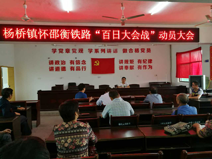 杨桥镇怀邵衡铁路“百日大会战”动员大会现场 9月28日上午,邵东县杨桥镇怀邵衡铁路建设架梁节点动员大会在杨桥镇人民政府会议厅召开,会议由镇指挥部部长李兴科主持,镇长兼镇指挥部指挥申文杰、各村级干部及隧道公司怀邵衡铁路项目经理部代表参加了会议。 会上,李兴科首先阐述了怀邵衡铁路是邵东县政府重点建设项目,杨桥镇必须无条件确保架梁通道的畅通。会上提出对架梁、围栏、路基“三大任务”要逐项分解任务落实到队伍。组织机械、人员实现大干快上、组织到位、狠抓工期、日夜突击,加大与个村的联系沟通力度,尽量减少环境影响,争取群众的理解支持。 同时,李兴科宣读了铁路沿线各村管辖范围内的架梁时间节点,要求各村级干部切实做好本职工作,统一思想,明确任务,倒排工区,责任到人,力争于11月31号前完成本区域的无障碍架梁工作。 有了杨桥镇指挥部以及各村级干部对项目的大力支持,五局隧道人作为怀邵衡铁路建设者,必定会认真落实安全生产,在维护好生态环境的前提下,做到安全施工、文明施工,全面冲刺架梁节点目标,为怀邵衡铁路建设做出应有的贡献。(文/隧道公司怀邵衡铁路项目二工区:杨美玲)