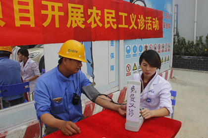 给劳务工友测血压  员工理疗中 9月28日下午,“弘扬地铁人文关怀,关爱工友身心健康”活动之关爱建筑工人义诊活动,在隧道公司深圳地铁9112-1项目部举行。因考虑到现场大干期间,此次活动共开展3天,由项目安全质量部和综合办公室联合主办,中医研究院促进会承办,活动参与对象有项目管理人员和劳务队工友。 在活动现场,工地的农民工朋友和项目管理人员有秩序排队等候问诊,中医研究院促进会医务人员为农民工朋友免费提供了测血压、中医把脉等项目的体检,还对大家提出的中医健康及咨询等一一回复。由于场地问题,对常见的职业病咨询与治疗,在办公室内进行,如:颈椎病、肩周炎、痛风等,用研究院赞助的设备为大家进行调理。在检查期间医生为检查的朋友们讲解一些生活健康知识,以及疾病的预防与治疗,深受建筑工人的欢迎。 “在城市里打工的农民工,用他们的心血和汗水为城市贡献着力量,有的人甚至将一生都献身于城市的建设之中,这是他们应该得到的回报和关爱。而我们的管理人员长期跑工地,有的甚至通宵工作,有的在办公室一坐就是十几个小时,得了颈椎病、高血压、腰椎间盘突出等等,这都是有必要的检查。”安全总监李小勇感慨着说。 通过这次活动,呼吁大家更多地关注建筑工地的参与者,关注他们的健康问题,让他们能够享受到社会给予的关怀,在深圳这座和谐包容的城市里尽情享受生活,快乐工作。此外,我们项目还要将信和夜校越做越好,多做培训,给他们传达更多的安全和健康知识,和农民工朋友一起在开展座谈会,听听他们的声音,完善工作措施,更加接地气的与他们沟通。(文/深圳地铁9112项目 江致贵)