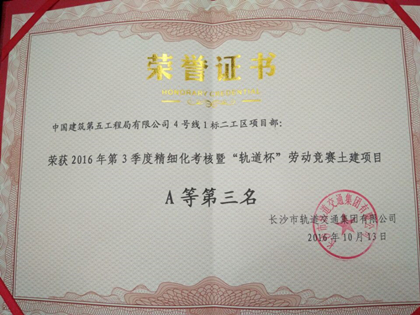 10月13日传来喜讯,隧道公司长沙地铁4号线汉王陵公园站在长沙市轨道交通集团有限公司举办的2016年第3季度精细化考核暨“轨道杯”劳动竞中荣获赛土建项目A等第三名。