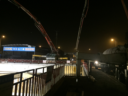 时间推回到10月10日晚7点,白班晚班完成交接班,主体队伍进场加班,现场虽天色已黑却不减忙碌,晚上计划要浇筑第十七段负二层南端头墙、东侧墙以及十六段顶板,白天通过东侧墙浇筑前验收,但南端头墙大模还未调好、十六段顶板还未过检,可谓任务艰巨。在此时梅溪湖搅拌站反映长沙砂石材料严重匮乏,市场上出货有限,已经满足不了项目需求,站里的砂石仅能打300方混凝土,对于我们顶板计划340方加侧墙计划124方来说无疑是一个噩耗。王承科得知消息后第一时间全力协调,最后从两个搅拌站发来混凝土料来浇筑。