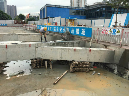 隧道公司深圳地铁9111标临海路站为地下两层岛式站台、多跨框架结构车站,采用明挖法施工。车站全长157.5米,标准段宽为20.2米。基坑共有三道支撑梁,其中第一道混凝土米字支撑,二、三道为钢支撑。随着车站主体结构顶板混凝土强度已达到设计强度的70%,可以对临时混凝土支撑进行拆除施工,根据现场实际情况,本车站砼支撑拆除采用机械切割分离,后采用吊机吊装、然后板车外运的方法进行拆除,经过一昼夜的奋战,首根混凝土支撑成功拆除并外运。