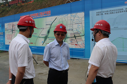7月9日,重庆市发展与改革委员会副主任欧阳林一行到中建隧道龙洲湾项目施工现场进行调研指导,重庆茂和基础设施建设有限公司董事长吴建良、龙洲湾一分部项目经理张吉港等陪同。