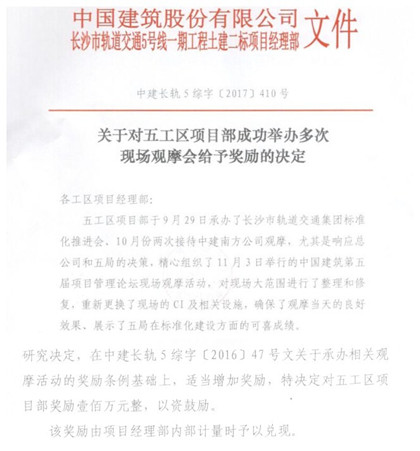 表彰文件中指出,项目部于9月29日承办了长沙市轨道交通集团标准化推进会、10月份接待两次中建南方公司观摩,尤其是积极响应总公司和五局决策,精心组织了11月3日中国建筑第五届项目管理论坛现场观摩活动,且活动均取得圆满成功,向业主、中建总公司、五局、内部单位和广大媒体展示了长沙地铁5号线标准化建设的良好风貌,得到了业主及社会各界的广泛好评。