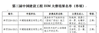 近日,中国建筑业协会官网公布第三届“中国建设工程BIM大赛”评奖结果,中建隧道《复杂条件下地铁车站(彭城广场站)施工BIM技术应用研究》和《BIM技术在矿山法隧道施工中的应用》喜获两个施工单项BIM应用三等奖。此次获奖是中建隧道首次获得BIM类国家级奖项。