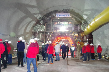 随后,观摩人员来到正在作业的黄岭坡隧道进口正洞隧道内观摩,全自动液压衬砌台车、全自动液压式仰拱栈桥、防水板铺设钢筋绑扎台架等大型机械设备完整展现在观摩人员面前,隧道两侧小型工装及成品展示台架上摆放这各种衬砌施工小型先进机械设备和加工完成的合格成品,包括隧道衬砌预埋槽道、钢筋挤压套筒连接成品样件、止水带热熔焊接等。观摩人员对正在做业的隧道衬砌多功能养生台车,连连称赞,受益良多、不虚此行。