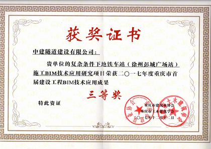 12月12日,重庆市建筑业协会召开重庆市建设工程BIM技术应用交流暨成果发布会,中建隧道《复杂条件下地铁车站(彭城广场站)施工BIM技术应用研究》、《巴南区龙洲湾隧道工程BIM技术在矿山隧道施工中的应用》分别获重庆市首届建设工程BIM技术应用大赛三等奖、优秀奖。此次获奖是中建隧道继获得BIM类国家级奖项之后获得的省部级大奖。