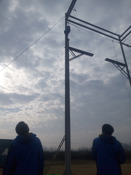 在空地上竖立一根8米高的铁杆,参赛队员需爬上铁杆,站到铁杆顶端的一个大概直径为20厘米圆盘上,然后在空中跃起,抓住前方的小单杠。