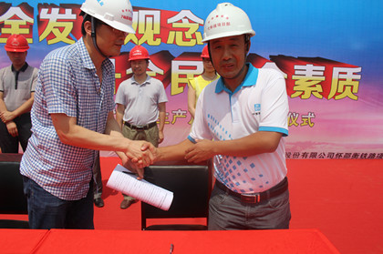 “安全生产月”启动仪式全景  安全生产责任书交换  李海滨宣布“安全生产月”正式启动 为落实“生命至上,安全运营第一”的安全理念,6月6日,隧道公司怀邵衡铁路项目在怀邵衡邵东制梁场开展了“安全生产月”启动仪式。邵东县怀邵衡铁路建设协调指挥部指挥长刘文中、铁科院监理站站长陈丽波、怀邵衡铁路邵阳建设指挥部主任李海滨、项目管理人员及劳务人员约110人参加。 启动仪式由项目书记韩学斌主持,项目安全质量部长张自维代表管理人员发言,项目总工李龙与一、二分部经理、梁场分部经理交换安全生产责任书。随后,李龙代表项目执行经理张永红发言并对安全生产月活动提出要求:一是安全生产不是口号,要落到实处,要常抓不懈;二是全体员工在安全生产上要统一认识,要有如履薄冰、如临深渊、如坐针毡的危机感。 最后,刘文中、陈丽波、李海滨就“安全生产月”活动依次进行了发言。刘文中强调“安全生产,常抓不懈”;陈丽波强调“安全责任,重在落实”。李海滨提出两点希望:一是希望将安全工作真正落到实处,认真开展安全教育和培训;二是希望中建股份以本次“安全生产月”为契机,持续推进安全工作。 今年安全月活动的主题“强化安全发展观念,提升全民安全素质”。通过此次活动,旨在提高全员的安全意识和安全技能,同时也拉开了安全生产月活动的序幕。(文/隧道公司怀邵衡铁路项目:郭少凤)