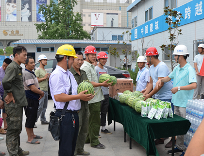 在施工现场,项目工会成员把藿香正气水、十滴水及西瓜、盐汽水等防暑降温物资送到工友手中,并和工友亲切交谈,详细询问他们的生产生活情况,并对他们的辛勤劳动表示感谢。项目生产经理赵峰再三嘱咐:“高温季节人容易疲劳,现场施工要讲究效率,合理安排作息时间,不打疲劳战,既要严格把好进度、质量关,又要做好安全生产及防暑降温工作。”