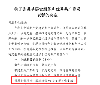 7月4日,深圳地铁9112-1项目迎来喜讯,项目党支部获得2017年度“中建南方先进基层党组织”荣誉称号,是中建南方投资有限公司直营项目中唯一一个获此殊荣的党支部,充分体现了各级领导对项目党建工作的认可。