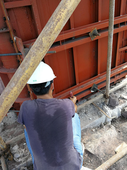 为确保施工进度,项目部多措并举,合理安排施工时间,采取先进施工工艺,确保施工顺利进展,严格按照施工计划进行。7月23日下午6点准时进行D1墩身的浇筑,工人们带好安全帽、绑好安全带,由上下通道走上墩身脚手架。C30混凝土由47米汽车泵向墩身模板内输送,随着混凝土的浇筑,工人们使用振捣器开始振捣,振捣器垂直上下、插点分部均匀。晚上7点36分完成墩身混凝土浇筑,施工过程非常顺利。