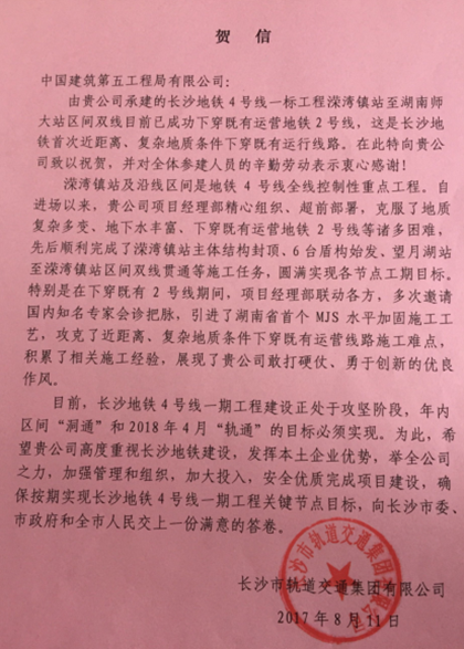8月16日,中建五局收到长沙市轨道交通集团有限公司发来的贺信,对中建隧道长沙地铁4号线一标工程全体参建人员致以诚挚的问候,并向公司表示热烈祝贺。