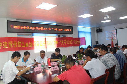 9月19日,中建隧道蚌五项目召开“大干120天,攻坚克难保目标”启动大会,蚌五高速管理公司副总经理胡国荣、驻地办监理总监滕升起、项目公司工程主管陈晨、总包项目经理王威等人员出席会议。