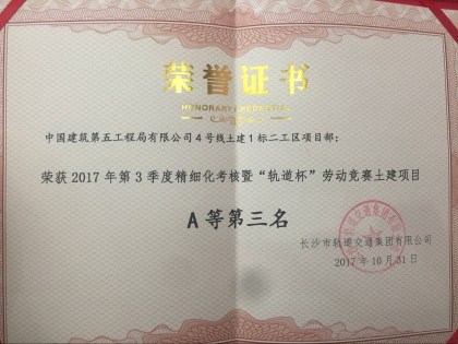 10月31日,长沙市轨道集团召开2017年度第三季度精细化考核暨“轨道杯”劳动竞赛讲评会,中建隧道盾构分公司长沙地铁4号线汉王陵公园站项目以总分92.37分名列前茅,喜获A类考核等级第三名。